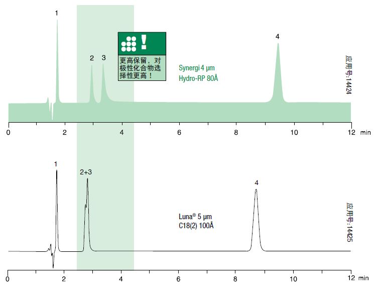高极性的化合物在常规C18柱中不易保留和分离。Synergi Hydro--RP是一个拥有独特极性端基封尾的C18键合相,能够在100%水相条件下保持对疏水性化合物和极性化合物的高保留。高表面积的4μm硅胶(475 m2/g)与致密的键合相覆盖结合,令分析物与键合相充分作用,使这根高保留的C18色谱柱成为分离强极性化合物的极佳选择。